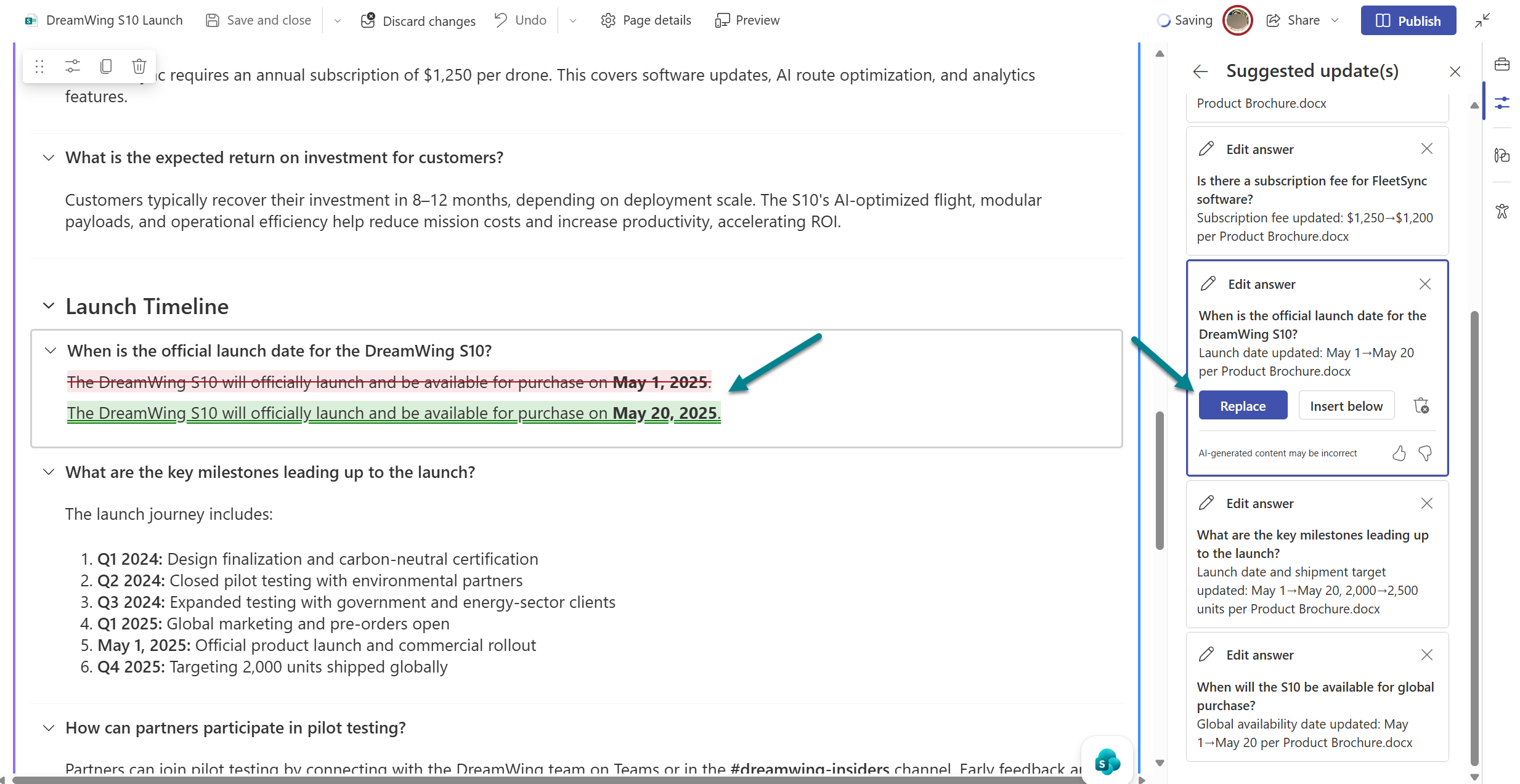 AI monitors your grounding files and user-submitted questions. When it detects changes—like updated pricing or new launch dates—it suggests updates. You can accept, edit, or dismiss them.