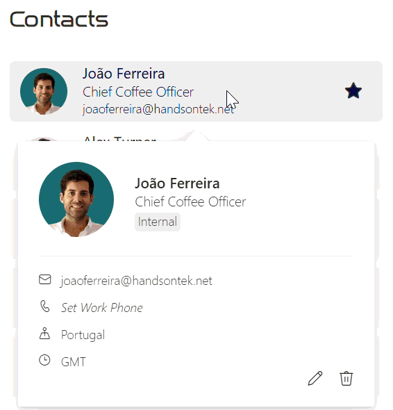 Both internal and external contacts live in the same list. The distinction exists in how the data is stored, not in how it is consumed.